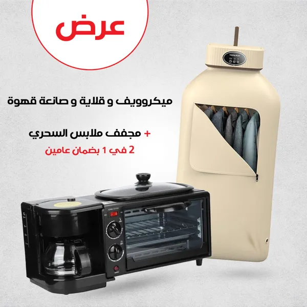 • المميزات: • يوفر لك فطور كامل سريع من جهاز واحد • تقدر تسوي قهوة وتحمص وتطبخ بوقت واحد • مجففة ملابس تجفف 9 قطع خلال 20 دقيقة • تشغل بهدوء وما تسبب أي إزعاج بالبيت • الجهازين موفرين بالكهرباء ويقللون الفواتير • حجم صغير ومناسب للشقق والرحلات والسفر • صناعة متينة تضمن معك استخدام طويل وآمن • سهولة تشغيل بزر بسيط أو مؤقت حسب الحاجة • تصميم أنيق يضيف لمسة مرتبة لمطبخك وغرفتك • عرض عملي يوفر وقت وجهد بتنظيم حياتك اليومية